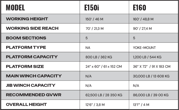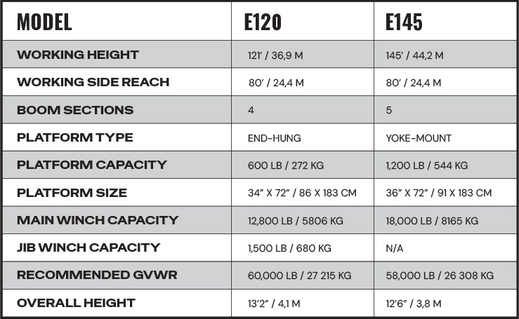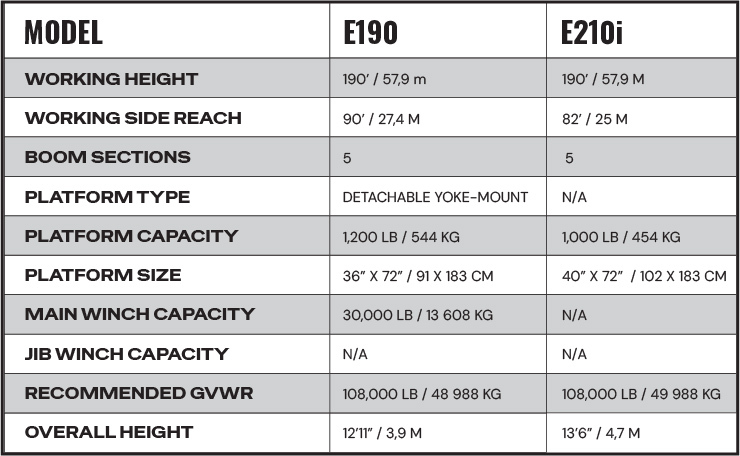 Main Boom Winch: Options typically range up to 30,000 lbs capacity on the E190 and vary across the product line. The wench is ideal for lifting heavy utility components such as transformers, insulators, or crossarms from the ground.